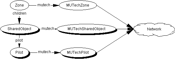 In order to separate out the information only relevant to specific networking technologies. We define a concept called a MUtech (pronounced mew-tek), the MUtech is the code which manages sharing the state of the world, its exact characteristics will vary from supplier to supplier. The choice of MUtech is made by the author of the world, who adds at least one Zone node, and a MUtechZone to their world. The term "MUtechZone" is used to mean any one of the vendor-specific nodes for handling networking. For example a ParaGraphZone node. At run-time the MUtechZone will add corresponding MUtechSharedObject and MUtechPilot nodes to the various SharedObjects and Pilots in the Zone, to generate a scene graph looking like: