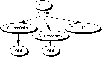 The Zone node usually represents an area of physical space, (although it could be more abstract), this is usually the unit of sharing, i.e. either everything in a Zone will be shared or nothing. The Zone contains SharedObjects, which may correspond to physical objects in the space, or something more abstract. SharedObjects can have Pilot nodes, a Pilot node typically has the code that changes the shared state of the SharedObject.