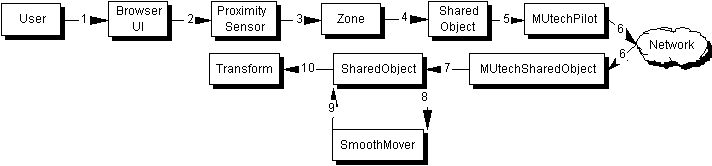 Living Worlds took the same approach as VRML2.0 of defining lots of small nodes, that can be composed in different ways, rather than a few mega-nodes. This can make event flow difficult to follow, so here is an example of event flow for the common case of motion.